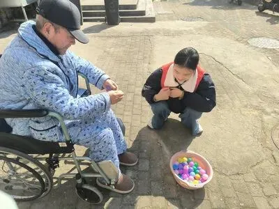 在志愿者的引导下,老人们纷纷走出房间,来到阳光明媚的庭院中。投球游戏成为最受喜爱的环节——志愿者蹲在轮椅旁耐心示范,老人们手持彩色小球,瞄准桶口投掷,每一次成功都引来阵阵掌声与欢呼。一位奶奶笑着说:“好久没这么开心地玩了,这些孩子就像自家孙辈一样亲!”