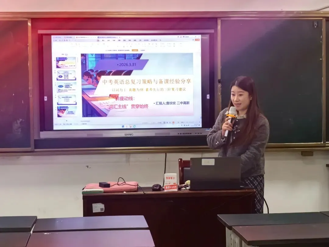 随后,南昌二中高新校区优秀英语教师查纹纹作了《中考英语总复习策略与备课经验分享》专题汇报。她围绕“以词为王、真题为纲、素养先行”的复习思路,细致拆解以词汇为主线贯穿复习全过程的实操方法,强调“无词汇无阅读、无词汇无语法、无词汇无写作”的核心逻辑,为集团初三英语复习与集体备课提供了可落地、可复制的实践经验,助力教师精准把握复习节奏,提升备考实效。