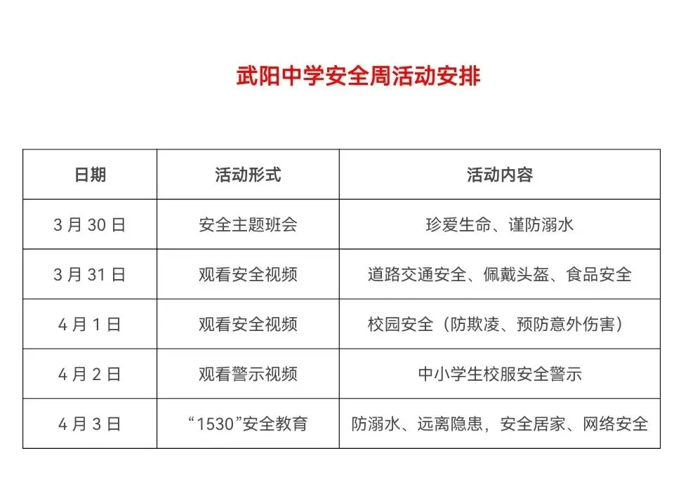 2026年3月30日是第31个全国中小学生安全教育日。为进一步加强安全教育工作,提升中小学生安全防范意识和自我保护能力,营造全社会共同关心学生安全的良好氛围,武阳中学于3月30日—4月3日组织开展全国中小学生安全教育周活动。今年的活动主题是:同守护,共成长。