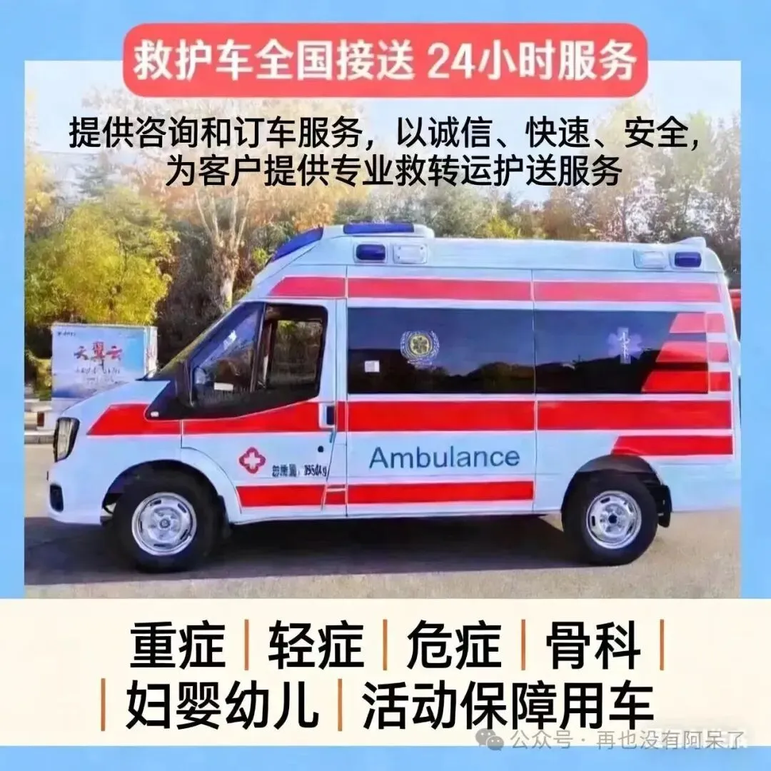 我们是救护车出租转运公司,120救护车接送病人预约护送。24小时为术后康复、危重患者及跨区域就医人群提供专业医疗转运服务,提供120救护车出租‖救护车转运‖私人120救护车(非急救)‖跨省长途转运‖危重病人转运‖市内转运‖术后康复病人转运‖高铁病人转运‖患者返乡‖大型活动赛事保障‖配备ICU设备:呼吸机▪心电监护仪▪吸痰器•微量泵•氧气▪急救药箱▪专业医护团队