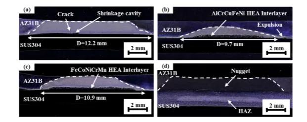 引入高熵合金中间层可显著改善 Mg / 钢电阻点焊成形质量,FeCoNiCrMn 中间层可实现无缺陷焊接。