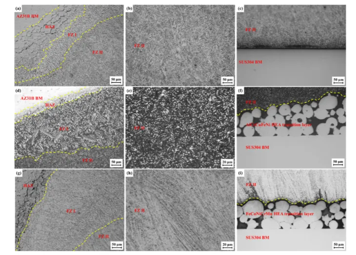 图 5 有无添加高熵合金中间层的镁 / 钢点焊接头不同区域显微组织:(a)–(c) 直接焊接;(d)–(f) 添加 AlCrCuFeNi 中间层;(g)–(i) 添加 FeCoNiCrMn 中间层。