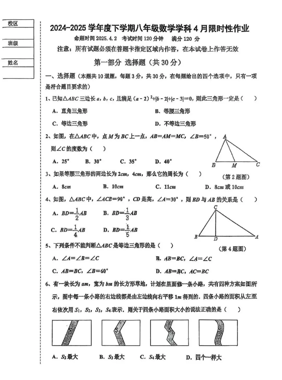 沈阳市南昌中学2024-2025学年七年级下学期4月月考数学试题