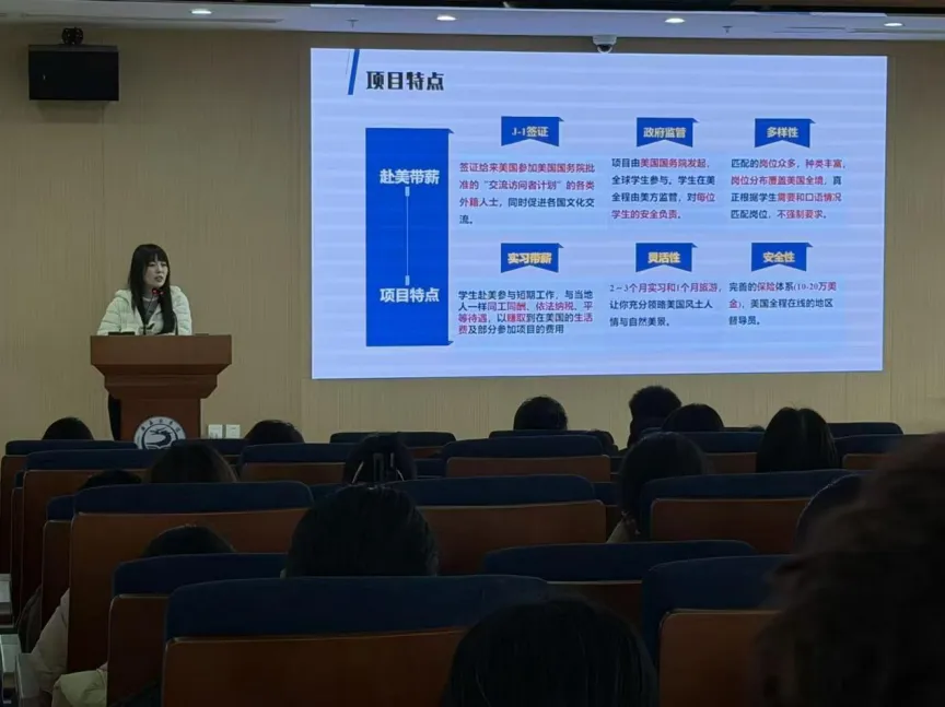会议伊始,项目负责人姜德美老师以一段往届学生参与暑期赴美带薪实习项目的纪实短片拉开本次宣讲序幕,视频中呈现的海外工作场景、全英文交流环境、多元文化以及美国城市风貌,充分激发了在场学生的参与热情。随后,姜德美老师围绕项目进行详细介绍,重点解读了本次暑期赴美带薪实习的核心亮点,她提到,该项目采用“带薪工作+语言提升+文化探索”模式,让学生在获得实践收入的同时,沉浸式锻炼英语口语,拓展国际视野,体验多元文化。