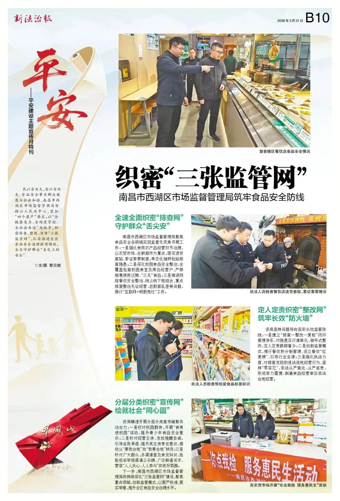 民以食为天,食以安为先。食品安全事关群众健康与社会和谐,南昌市西湖区市场监督管理局坚持以人民为中心,紧扣“四个最严”要求,以“全链条发力、全维度管控、全社会共治”为抓手,织密排查、整改、宣传“三张监管网”,扎实推进全区食品安全治理提质增效,全力守护群众“舌尖上的安全”。
