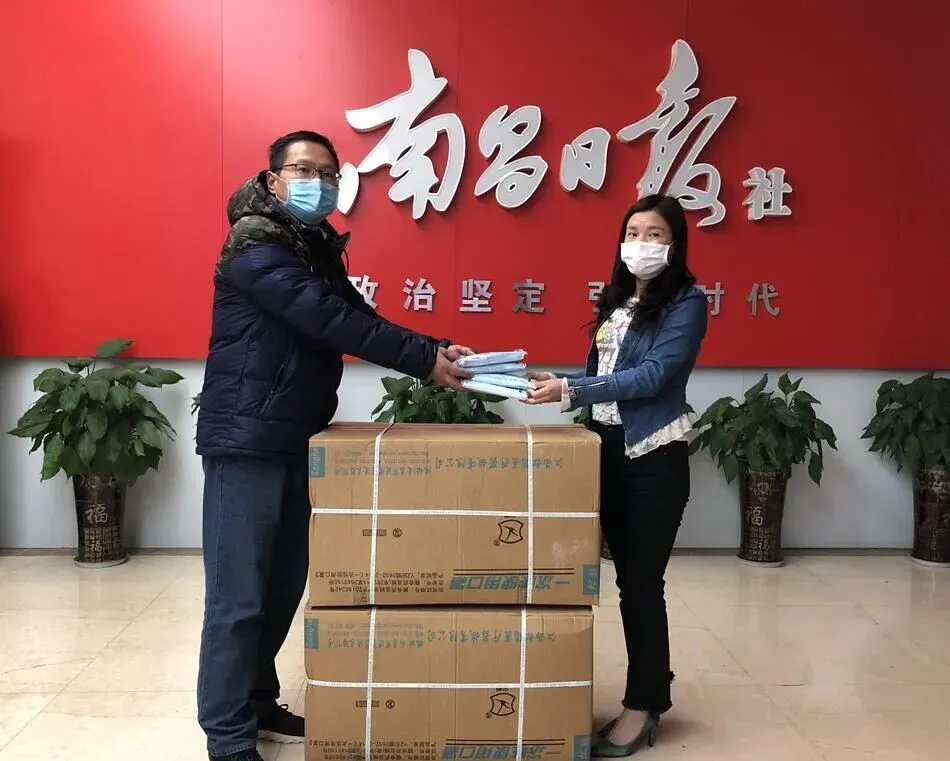 3月27日上午,南昌市生态环境局的工作人员将口罩送到了南昌晚报编辑部