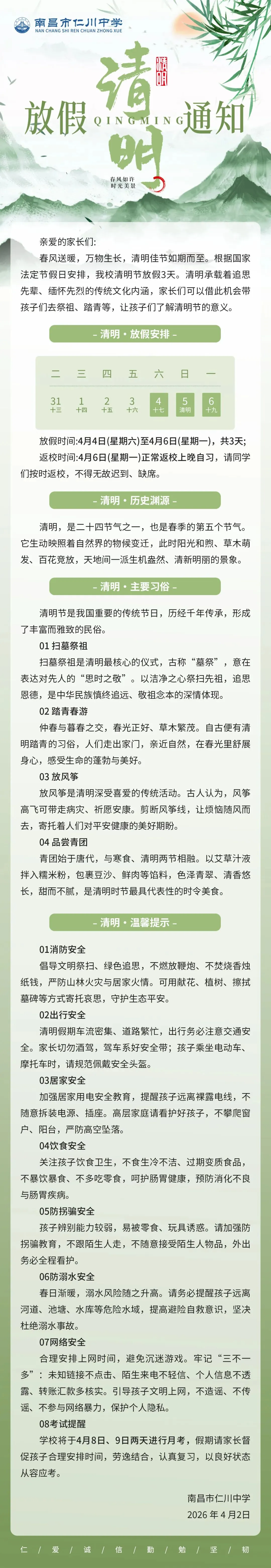 春和景明忆清明,平安相伴赴春光|南昌市仁川中学清明节放假通知