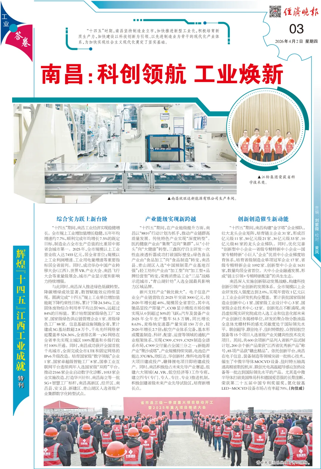 新兴支柱产业“做优做大”。电子信息产业全产业链营收在2025年突破3000亿元,较2020年增长超40%,规模居全省首位,其中兆驰晶显投产即量产,COB显示模组市场份额实现从0到超过50%的飞跃;汽车及装备产业2025年全年生产整车51.5万辆,同比增长8.63%,麦格纳变速器产量突破150万台,较2020年增长2.7倍;航空产业体系完备,基本形成覆盖制造、科研、配套、运营等领域的通航产业框架体系,实现C909、C919、C929制造全谱系布局,C909交付量占全国三分之一;新能源产业“聚沙成塔”,产业规模持续突破,电池总产能达37GWh,欣旺达、华创新材、维科电池等重大项目建成投产,赣锋锂电项目即将建成投产。同时,南昌积极抢占未来先导产业赛道,组建六大领域(AI、VR、低空经济等)工作专班,建立“四专”(专门、专人、专注、专业)推进机制,积极创建省级未来产业先导试验区,培育新增长点。