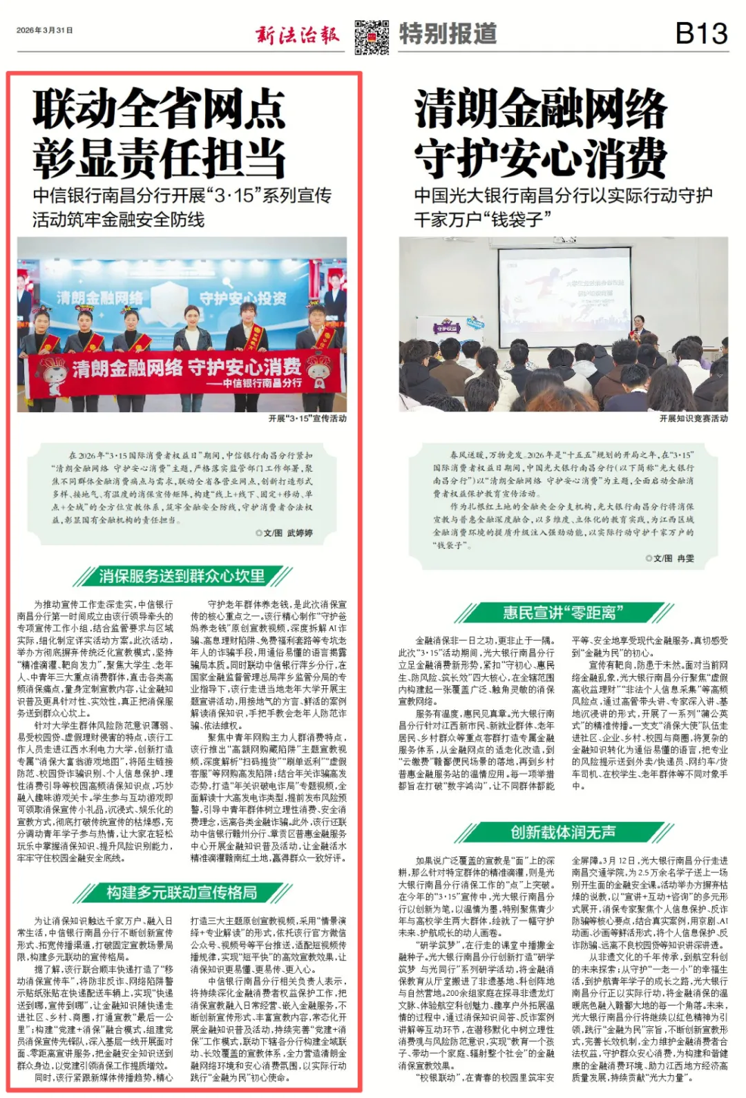 在2026年“3·15”国际消费者权益日期间,中信银行南昌分行紧扣“清朗金融网络 守护安心消费”主题,严格落实监管部门工作部署,聚焦不同群体金融消费痛点与需求,联动全省各营业网点,创新打造形式多样、接地气、有温度的消保宣传矩阵,构建“线上+线下、固定+移动、单点+全域”的全方位宣教体系,筑牢金融安全防线,守护消费者合法权益,彰显国有金融机构的责任担当。