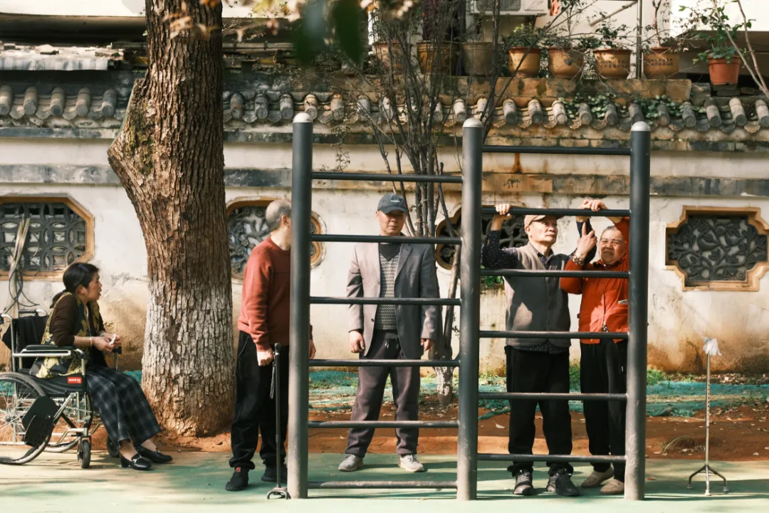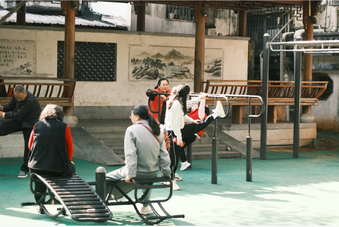 健身区里闲话家常