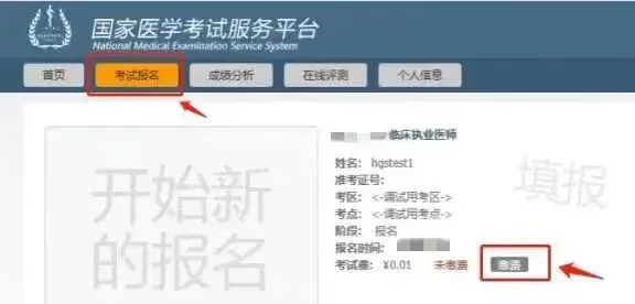 (一)缴费入口。考生登录国家医学考试服务平台考生服务端,考生资格审核通过后即出现“缴费”字样(见下图)。