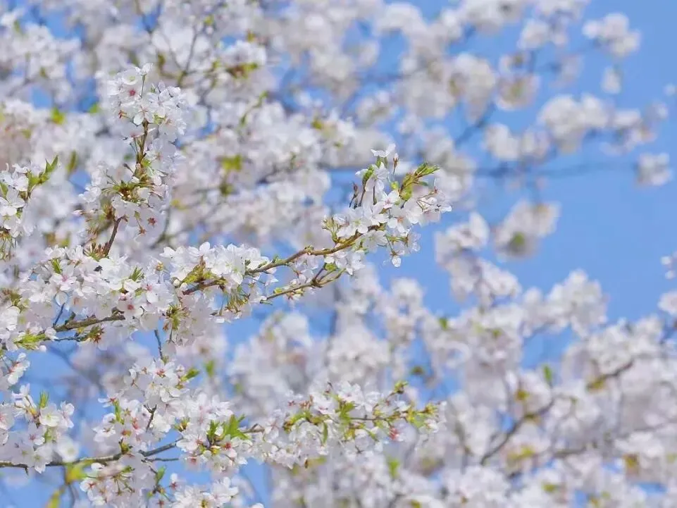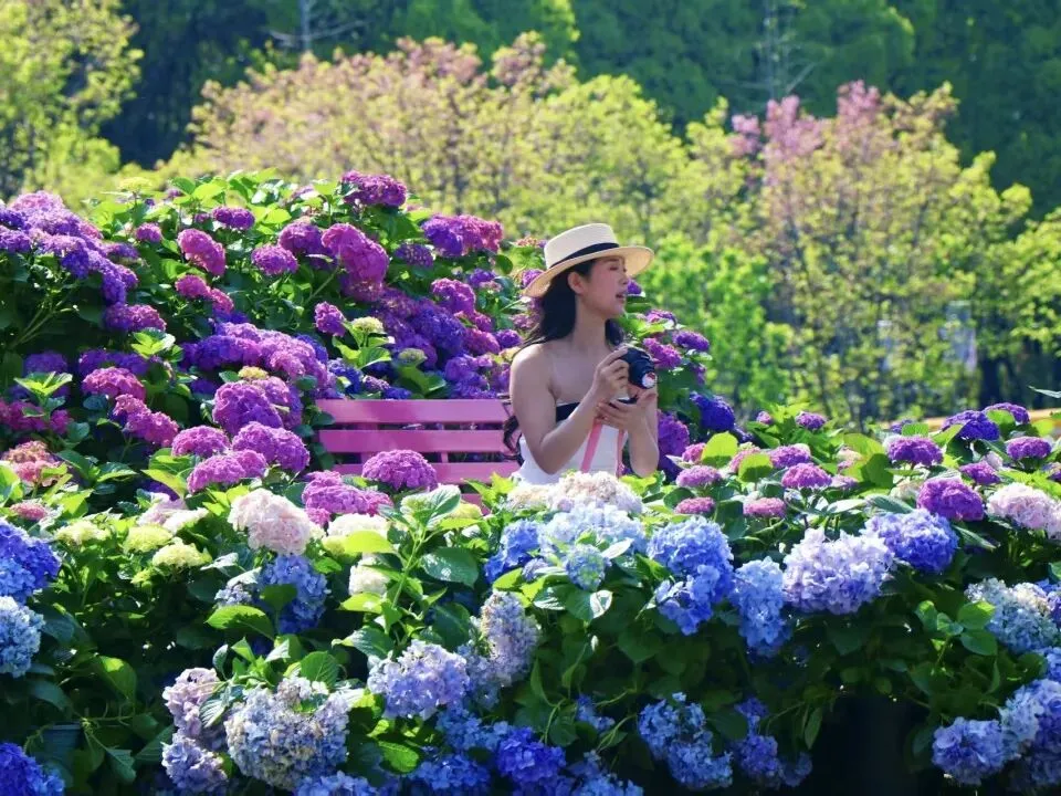 樱花、绣球、梨花竞相绽放,色彩斑斓如调色盘。