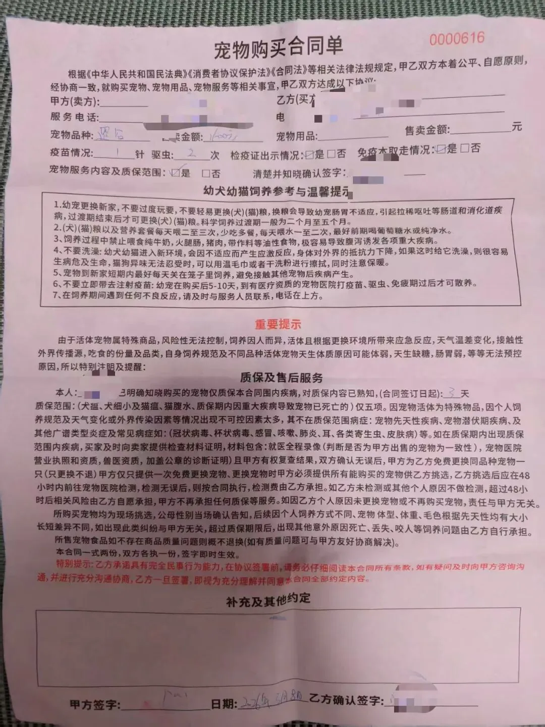 “合同中质保范围与免责条款极度不公:合同仅约定质保期为合同签订日起3天,质保范围仅限于猫瘟、猫腹水等5项重大疾病且宠物死亡情形,质保时长远低于行业普遍7—15天的质保标准。”汤女士表示,当初交易时店家口头承诺可以提供小猫的检疫证明迟迟未兑现。