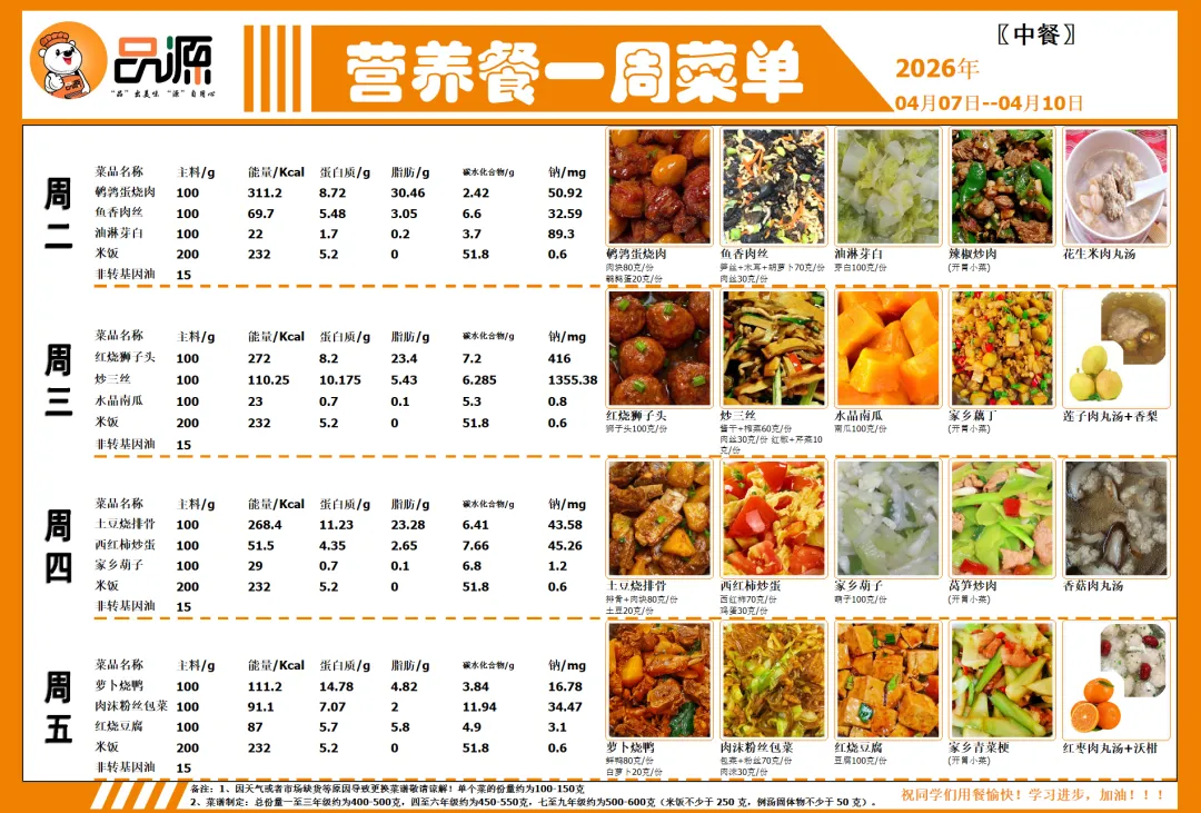 【第六周(2026年4月7日-4月10日)带量食谱公示】