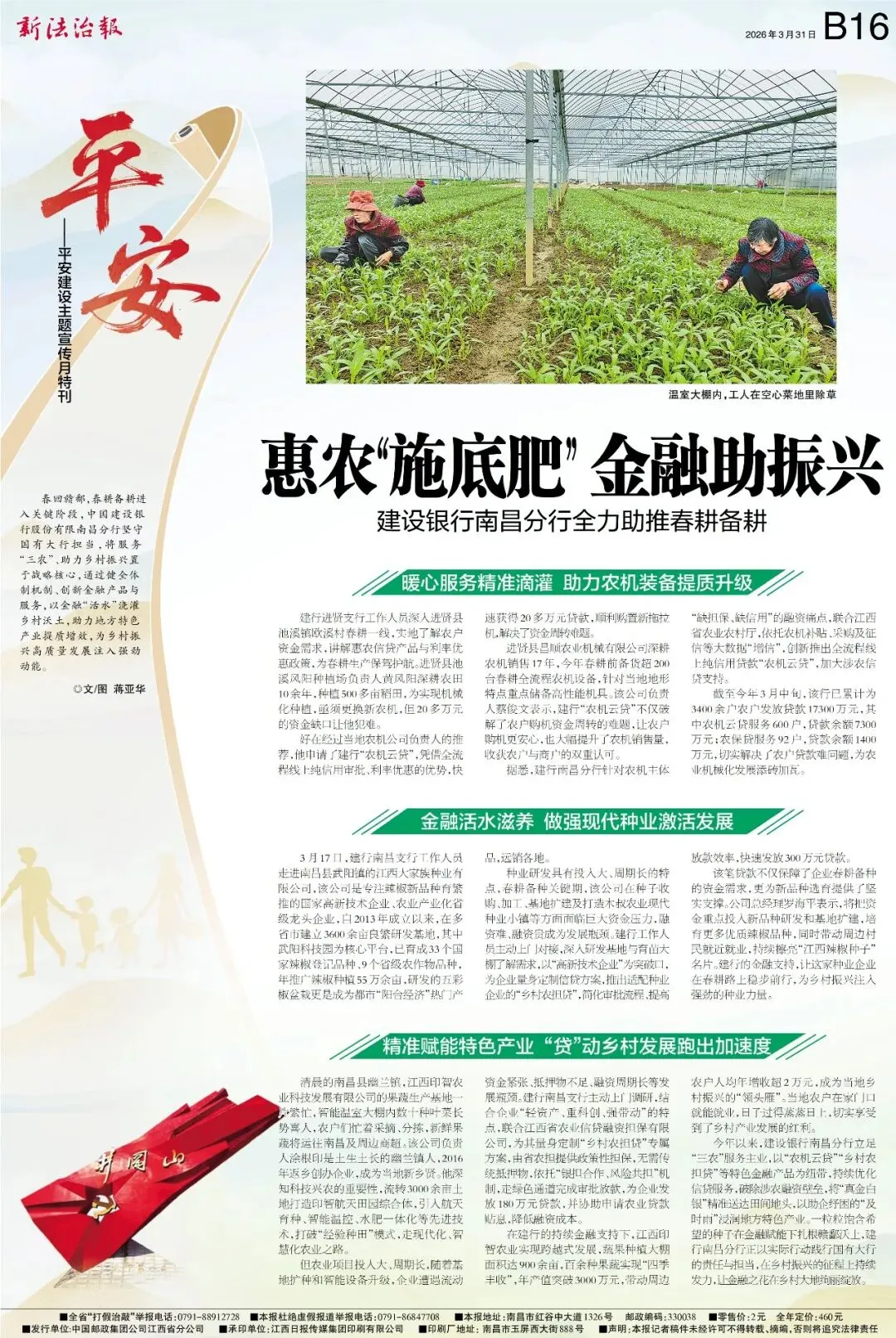 今年以来,建设银行南昌分行立足“三农”服务主业,以“农机云贷”“乡村农担贷”等特色金融产品为纽带,持续优化信贷服务,破除涉农融资壁垒,将“真金白银”精准送达田间地头,以助企纾困的“及时雨”浸润地方特色产业。一粒粒饱含希望的种子在金融赋能下扎根赣鄱沃土,建行南昌分行正以实际行动践行国有大行的责任与担当,在乡村振兴的征程上持续发力,让金融之花在乡村大地绚丽绽放。