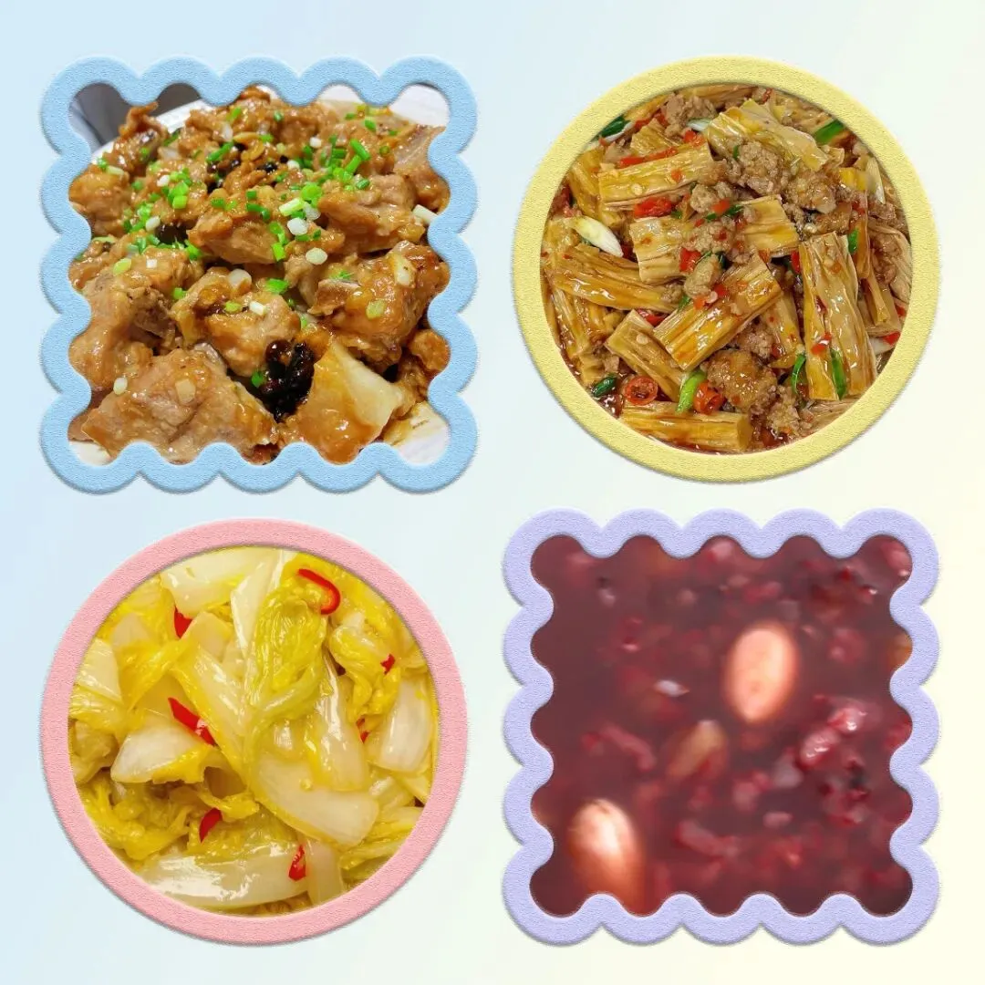 周一,芋头烧排骨,腐竹炒肉,清炒娃娃菜,红豆花生汤。
