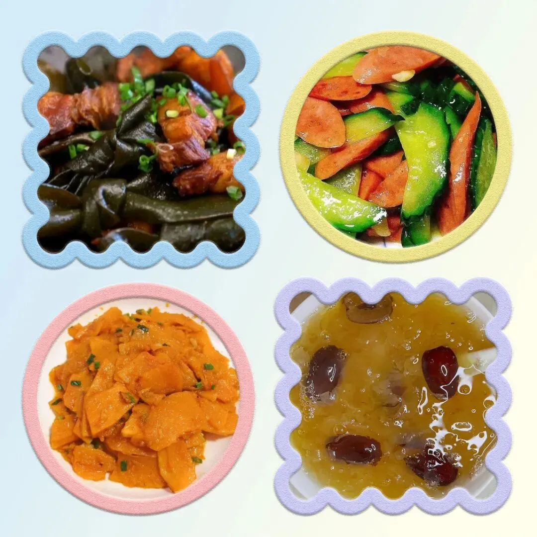 周三,海带结烧肉,黄瓜火腿肠,清炒南瓜,银耳红枣汤。