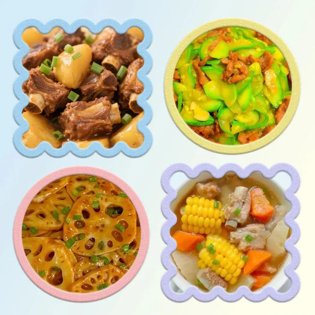 周四,土豆烧排骨,西葫芦炒肉,泡椒藕片,玉米排骨汤。
