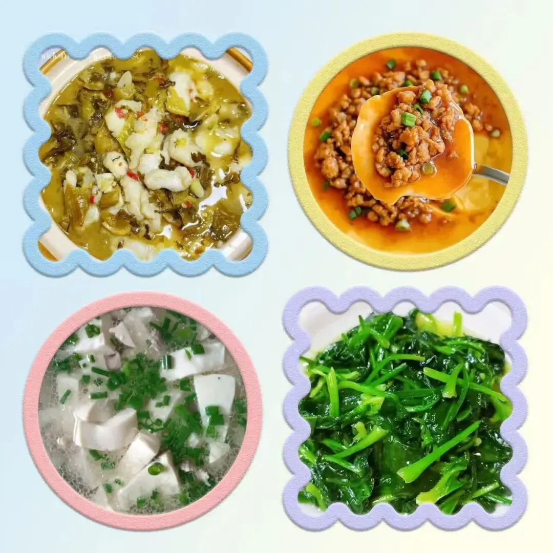 周五,水煮鱼片,肉沫水蒸蛋,清炒菠菜,豆腐肉沫汤。