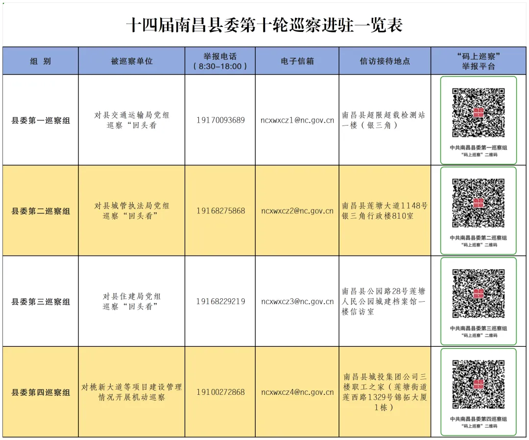 根据县委统一安排,近日,十四届南昌县委第十轮巡察已全部完成进驻工作。本轮县委巡察成立4个巡察组,对县交通运输局党组、县城管执法局党组、县住建局党组开展巡察“回头看”,对桃新大道等项目建设管理情况开展机动巡察。