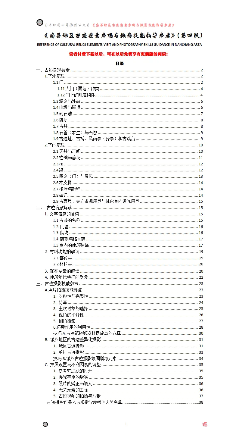 5.活动参与者享受古迹活动手册、《南昌地区古迹参观要素及摄影技能指导参考(第四版)》(自行彩印,提供免费阅读PDF文件)、《第十三届南昌市现存真古迹摄影及参观活动手册》、讲解与带路、定制活动纪念品徽章服务。