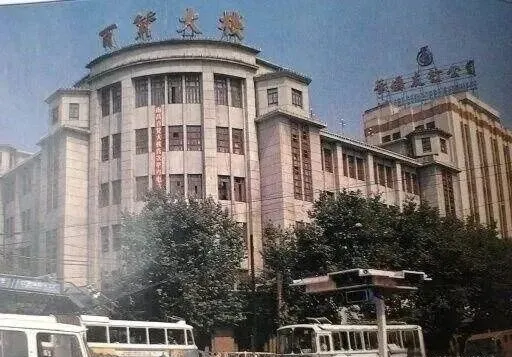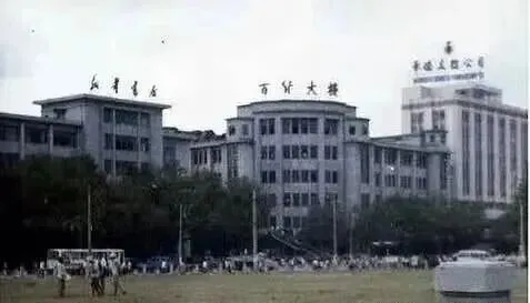 图里有三栋挨着的楼,最中间那个招牌大横幅写着百货大楼,两边是文明书店和友谊茶座,那年头带点事情出门都绕不过这地方,买自行车票、添新家电、领布票、都知道先逛一圈,有时候爸妈要买书还得从那条小门进去,门口经常一堆小孩瞅着最新连环画,站都能站半小时,现在这些场景见不到了,真觉得念旧