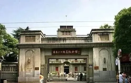 图中这幢灰色方方正正的建筑是八一起义纪念馆,大门两边有根石柱一直拱到门头,里面经常有团队排着队参观,小时候学校组织春游,我妈妈一边给我扎着头发一边说:“去了别乱跑,听老师讲”,光门口这铁栅栏就能让孩子们围成一圈,抬头扫一眼招牌字,历史感扑面