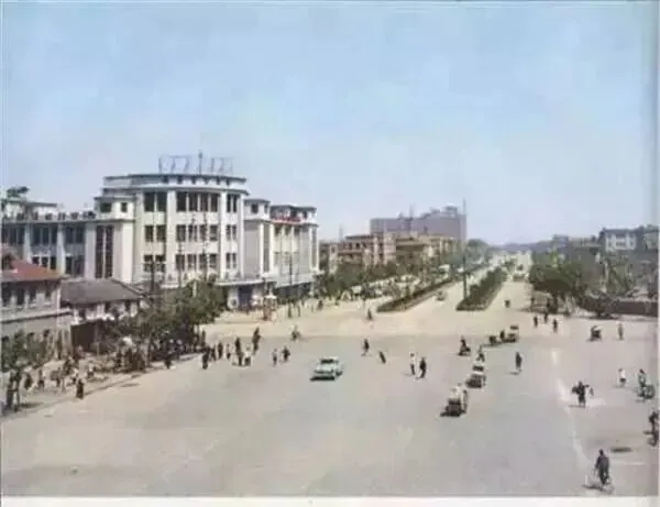 图里的路面还没铺上花砖,八一广场正好处在转盘的位置,白天马路宽宽敞敞,一辆自行车一辆三轮摩托慢慢晃,爷爷说那会儿街上骑自行车的,多数都是公家单位的职工,路两边商店成片,现在这里早变得不一样,老路口、老建筑只有老相片里才找得回来