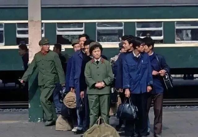 图中正是老火车站台的样子,一大队乘客排排站,蓝呢中山装、军绿色服装,看就是当年典型旅客打扮,手里的黑皮包和帆布卷铺盖,家里人讲,不管路远路近,只要要送人出门,包里总要塞点馒头咸菜和鸡蛋,那会儿买一张长途火车票,要早起排队,站台一片嘈杂,绿皮车厢窗边总能看人探头找熟人的影子