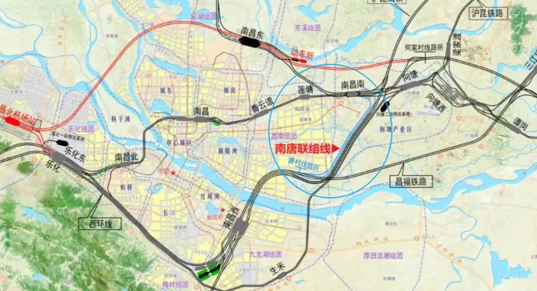 南昌铁路枢纽除了在建中的南唐联络线之外,还有横岗(连接京九线 ↔ 沪昆高铁)、乐化(连接昌九高铁 ↔ 昌九城际)、何家(连接南昌东 ↔ 昌赣高铁)等几条重要联络线。虽然 南唐联络线 和 乐化联络线(在建)等已能有效串联多数线路,但目前仍存在一个关键局限:沪昆高铁与京港高铁在东南方向尚不能直接互通。