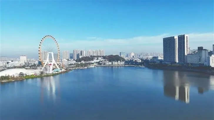 想感受城市里的水乡诗意,就去琵琶湖公园,这座县城中心的 3A 级景区,因湖形如琵琶而得名,是余干的 “城市绿心、文化地标”。园内 “干越新八景” 错落有致,105 米高的摩天轮矗立湖畔,亭台、拱桥、垂柳相映成趣,早晚沿着湖岸散步,湖面波光粼粼,随手拍都是江南水墨画,夜里灯光亮起,更是氛围感十足。