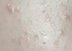 颗粒更圆润,表面有蜡样光泽,不会自行消退。