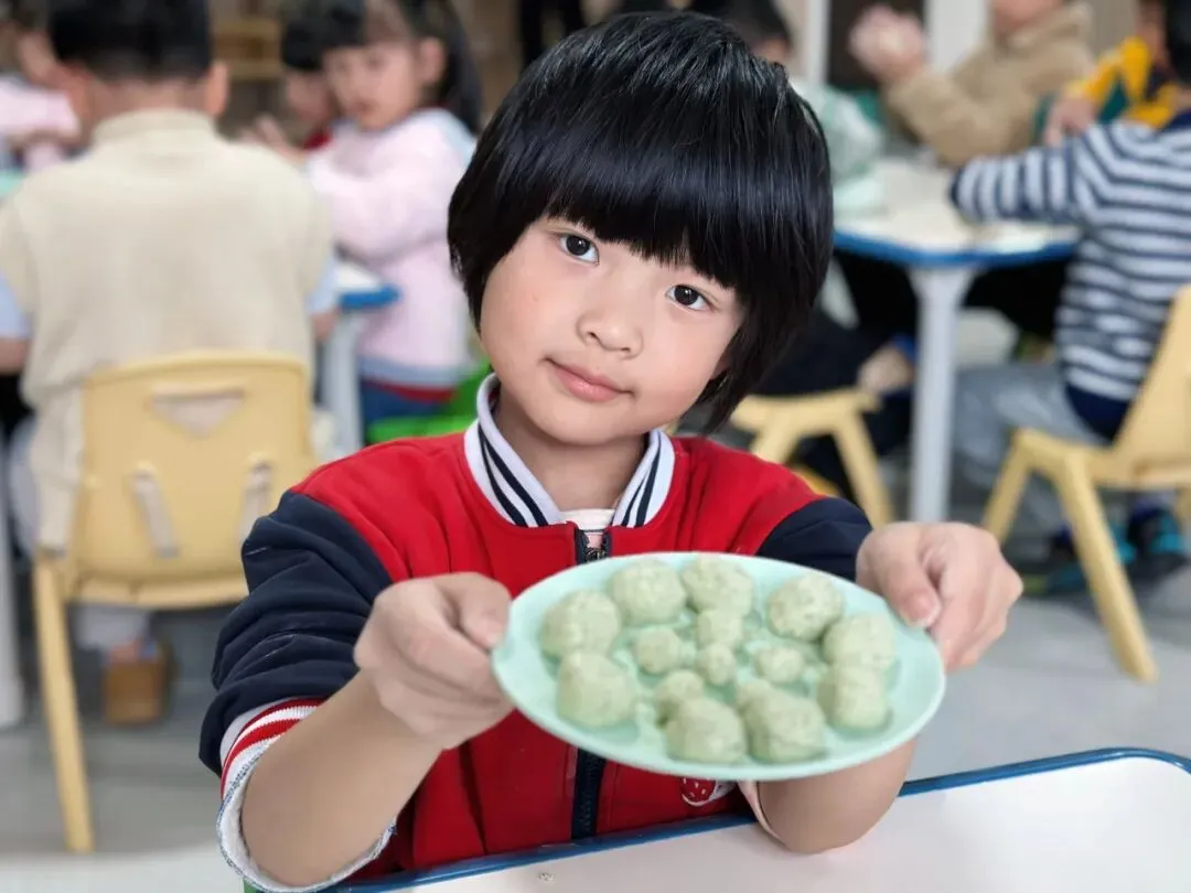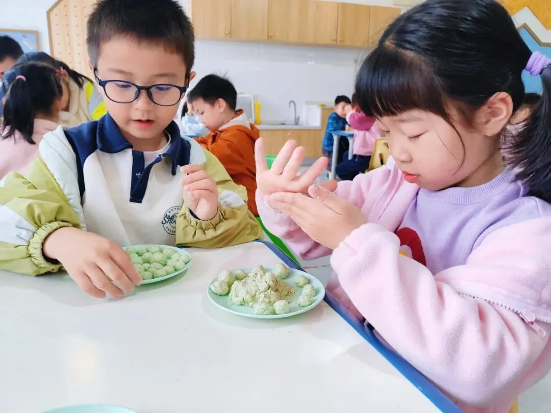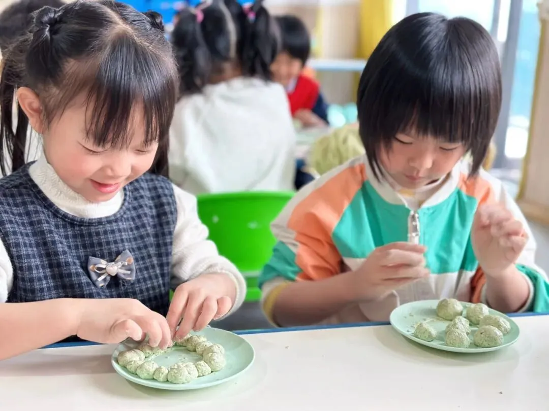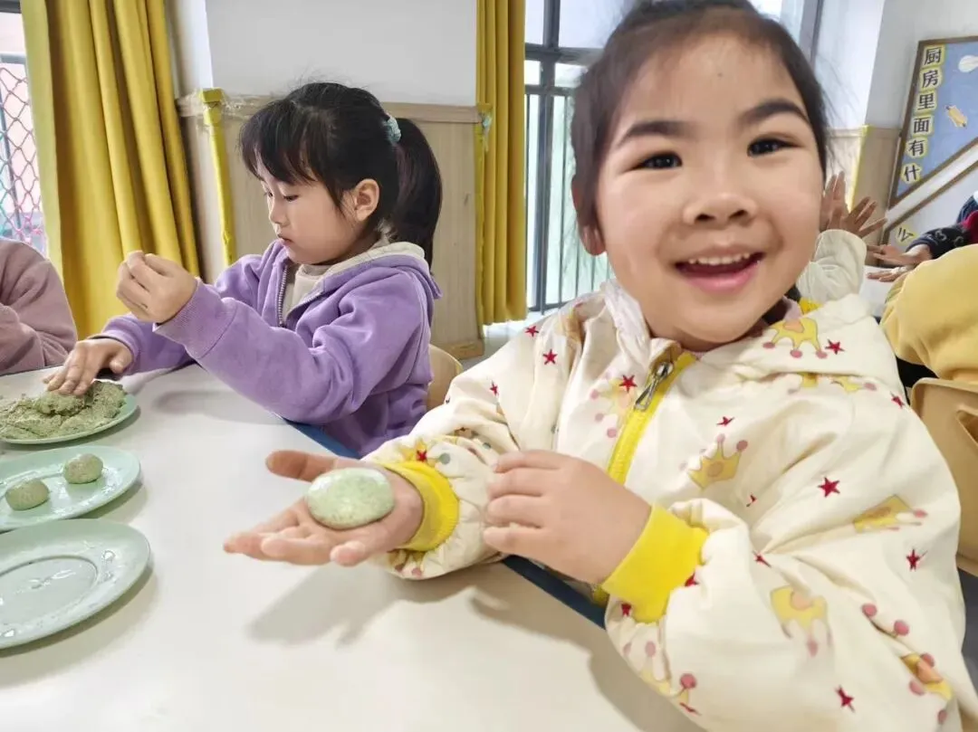 从清洗艾叶、焯水捣汁,到和糯米粉揉成翠绿面团,再到动手包馅、塑形,孩子们全程兴致勃勃地参与其中。一双双小手认真揉搓、小心包裹,将春日的生机与对传统的感知,都揉进一个个软糯的艾粿里。在亲手制作的过程中,孩子们不仅锻炼了动手实践能力,更真切感受到清明传统食俗的魅力,体会到劳动带来的快乐与成就感。