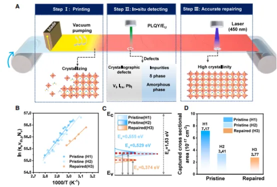 本研究提出并验证了一种适用于印刷柔性钙钛矿光伏的原位缺陷检测与精准修复策略。通过PLQY和EU测量实现对缺陷的快速识别,并利用450 nm激光进行精准修复。该策略有效消除了深层能级缺陷,优化了薄膜结晶质量,显著提升了器件性能、良率和稳定性。这项工作为克服大面积柔性钙钛矿光伏器件的性能和良率瓶颈提供了一种可行的技术方案,对其商业化进程具有重要的推动作用。