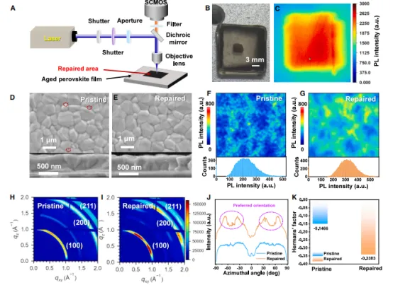 图1A展示了将原位缺陷检测与激光修复集成到印刷工艺中的完整流程:首先通过狭缝涂布制备大面积钙钛矿薄膜,随后利用PLQY和EU测量对薄膜进行快速检测,可视化地识别出缺陷和杂质的富集区域,最后使用450 nm激光对这些区域进行快速精准修复。图1B通过深能级瞬态谱的阿伦尼乌斯图拟合,提取了原始与修复后器件的陷阱能级深度,结果显示原始器件中存在两个位于价带顶上方0.555 eV和0.529 eV的深能级陷阱H1和H2,而修复后器件中这两个深能级陷阱消失,取而代之的是一个位于0.374 eV的较浅陷阱H3。图1C直观地展示了原始器件中深能级缺陷的存在以及修复后缺陷能级变浅的过程,其中峰的高度代表了缺陷态密度的大小。图1D给出了陷阱的捕获截面积对比,修复后器件的捕获截面积(2.77×10⁻¹⁷ cm⁻²)远小于原始器件(3.41×10⁻¹⁷ cm⁻²和7.17×10⁻¹⁷ cm⁻²),进一步证实了激光处理在消除深层能级缺陷、降低缺陷态密度方面的显著效果。图2A展示了基于科学级CMOS荧光强度成像的激光辅助修复过程示意图。图2B和2C分别为激光处理区域的光学照片和对应的荧光强度图,在3×3 mm²的处理区域内,颜色由近透明变为深棕色,且荧光发射显著增强,直接证明了激光诱导了非光学活性的δ相向光学活性的α相转变。图2D和2E展示了原始与修复后薄膜的表面及截面扫描电镜图像,修复后的薄膜晶粒尺寸明显增大,表面更加平滑,缺陷更少。图2F和2G为30×30 μm²区域的瞬态光致发光强度分布图,修复后薄膜的PL强度更强且分布更窄(~180-480),而原始薄膜分布较宽(~80-420),表明修复后薄膜具有更好的晶体均匀性。图2H和2I的掠入射广角X射线散射图显示,原始薄膜呈现德拜-谢乐环状分布,对应无序的(100)晶面取向;而修复后薄膜在φ≈36°和66°处出现了明显的布拉格斑点,表明在(100)晶面上形成了择优取向。图2J为沿(100)晶面环向的积分散射强度图,图2K计算了赫尔曼取向因子,修复后薄膜的取向因子(-0.3383)相比原始薄膜(-0.1466)提升了2.31倍,说明激光处理不仅消除了缺陷,还显著增强了钙钛矿晶体的取向性。