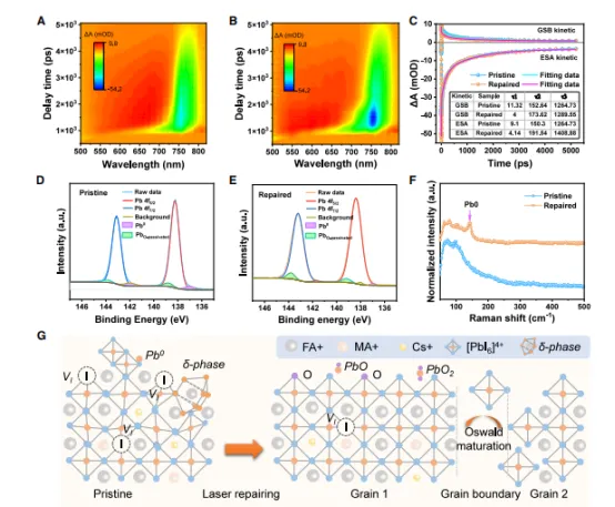 图3A和3B展示了原始与修复后薄膜的伪彩色瞬态吸收图,与原始薄膜相比,修复后薄膜在750-780 nm处展现出更深的基态漂白信号和更长的衰减时间,表明带边/激子态填充更完全,非辐射复合途径减少,载流子寿命延长;同时,650 nm附近的激发态吸收信号在早期更明显、后期衰减更干净,表明热载流子弛豫更快,与缺陷相关的长寿命激发态吸收被抑制。图3C对750 nm处的基态漂白信号和650 nm处的激发态吸收信号进行了三指数动力学拟合,结果显示修复后薄膜的快速弛豫过程t1从11.32 ps降至4 ps,这与增强的电子-声子相互作用相关;而较长的扩散/非辐射复合时间t2从152.64 ps增至173.62 ps,载流子寿命t3从1264.73 ps增至1289.55 ps,证实了缺陷的减少和材料质量的提升。图3D和3E为原始与修复后薄膜的X射线光电子能谱及拟合分析,原始薄膜中在136.8 eV处存在明显的金属铅(Pb⁰,非辐射复合中心)信号,修复后该信号显著减弱,同时137.6 eV和138.4 eV处归属于PbO和PbO₂的信号增强,表明激光促进了Pb⁰与吸附氧的配位。图3F的拉曼光谱也印证了上述结果。图3G总结了激光修复的四重机制:激光促进Pb⁰氧化为PbO/PbO₂;激光促进空气中氧钝化碘空位,形成I-Pb-O结构;激光诱导残余δ相快速转变为α相;激光促进钙钛矿晶体奥斯特瓦尔德熟化,消除晶界,释放应力,提升晶格一致性。
