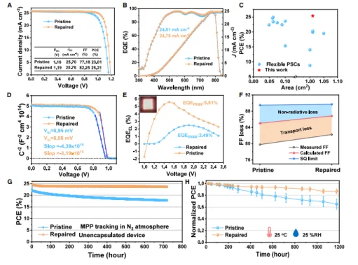 图4A展示了1.01 cm²柔性器件在AM1.5G光照下的J-V曲线,修复后器件的开路电压(1.19 V)和填充因子(82.25%)相比原始器件(1.16 V,77.18%)显著提升,冠军效率达25.21%,且正反向扫描迟滞可忽略,远高于原始器件的23.01%。图4B为对应的外量子效率曲线,原始与修复后器件的积分电流密度分别为24.51 mA cm⁻²和24.75 mA cm⁻²,与J-V测试结果吻合良好。图4C将本工作与近五年报道的柔性器件效率进行对比,红色五角星代表本工作,结果显示在1.01 cm²面积上取得的效率处于领先水平。图4D为莫特-肖特基曲线,修复后器件具有更高的内建电势(0.98 mV vs. 0.95 mV)和更低的掺杂浓度(斜率更大),表明耗尽层更宽,有利于光生载流子的分离和输运。图4E为电致发光外量子效率曲线,修复后器件的最大EQE从原始器件的2.49%提升至5.61%,对应的非辐射复合电压损失从0.095 V降至0.074 V。图4F为填充因子损失分析,结果表明缺陷诱导的非辐射复合是填充因子损失的主要原因,修复后该部分损失显著降低。图4G为氮气氛围下最大功率点追踪稳定性测试,修复后器件在720小时后仍保持92.86%的初始效率,而原始器件仅保持75.88%。图4H为25°C、25%相对湿度下的环境稳定性测试,修复后器件的T80寿命超过1200小时,远优于原始器件的约500小时。图5A对50个1.01 cm²柔性器件的性能参数进行了统计,修复后器件的各项参数(VOC、JSC、FF、PCE)分布更集中、平均值更高,展现了优异的工艺重复性。图5B和5C展示了100 cm²柔性组件的设计图与实物照片。图5D和5E为100 cm²原始与修复后柔性组件在开路电压下的光致发光强度分布图,修复后组件的PL强度更高、均匀性更好,表明大面积薄膜的缺陷得到了有效修复。图5F为100 cm²柔性组件的J-V曲线,修复后组件的冠军效率达17.36%,远高于原始组件的16.45%。图5G为基于50个独立器件的100 cm²修复后柔性组件效率统计,平均效率显著提升,分布集中。图5H将原始与修复后器件的冠军小电池效率、组件效率和良率进行对比,修复后组件在各项指标上均实现了显著提升,尤其是90%的高良率(原始为46%),充分证明了该技术在大规模制造中的实用潜力。