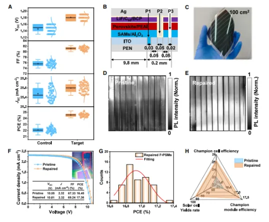 这项研究巧妙地将原位光谱检测与激光修复技术相结合,为解决大面积柔性钙钛矿光伏器件中因缺陷导致的性能和良率损失问题提供了新思路。通过PLQY和EU测量快速“看见”缺陷,再以450 nm激光实现精准“修复”,整个过程非接触、快速且高效。该策略不仅从机理上阐明了激光诱导的多重修复效应(如Pb⁰氧化、δ→α相变、晶体重构),更在1.01 cm²柔性器件(25.21%效率)和100 cm²柔性组件(17.36%效率)上取得了优异的性能,并实现了90%的高良率。这项工作充分展示了将先进表征技术与工艺调控深度融合,对于推动钙钛矿光伏技术走向产业化的巨大潜力。10.1016/j.joule.2025.102305