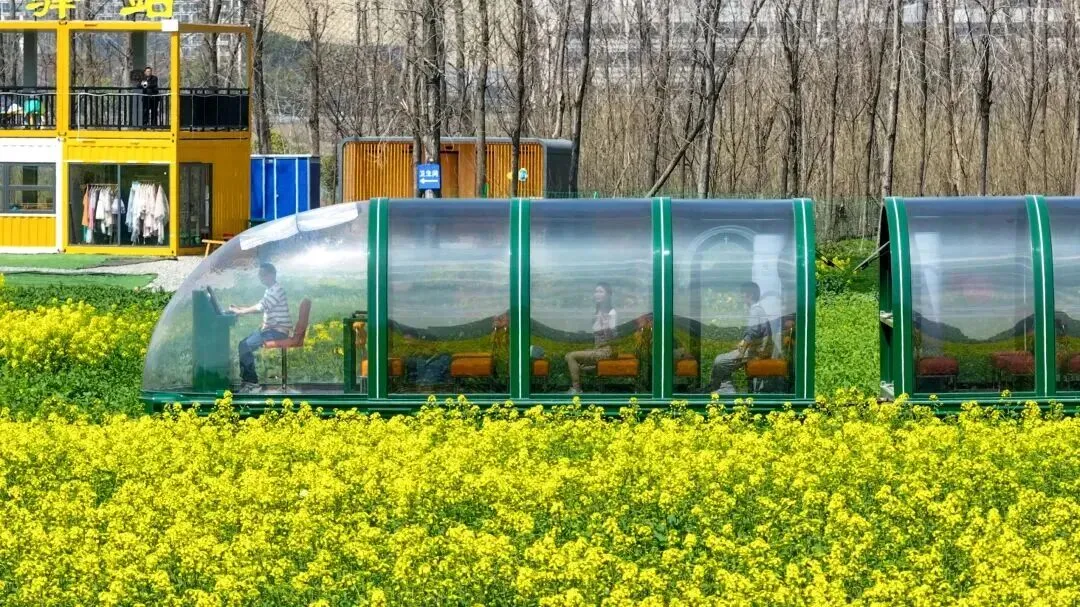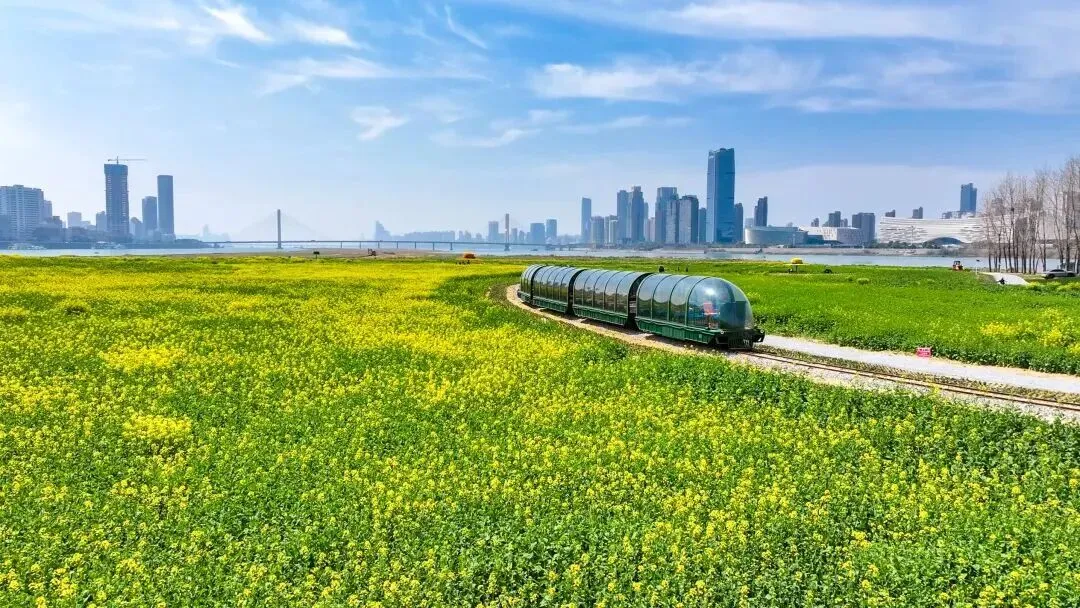 复古翡翠绿车厢,缓缓穿行在金浪间