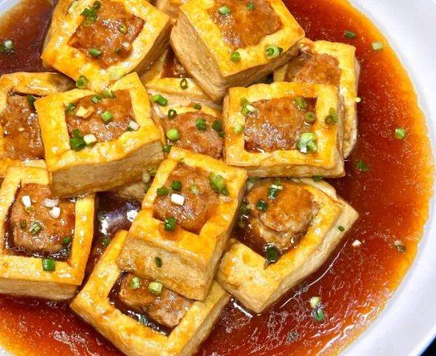 客家酿豆腐的做法其实不玄。嫩豆腐切块后挖空,塞进拌了葱姜的肉馅,先煎到两面微黄,再加酱汁小火焖。火候对了,豆腐吸满汤,肉也不老,一口下去,软和、鲜、稳,很像赣县这座城。