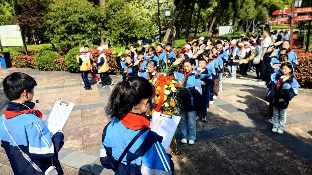 发言结束后,祭奠仪式进入核心环节。全体师生列队肃立,面向烈士纪念碑行注目礼、敬少先队礼,庄严的队礼承载着对先烈的崇高敬意。紧接着,全体师生举起右拳,进行庄严宣誓,“铭记历史,缅怀先烈;珍爱和平,强国有我!”铿锵有力的誓言回荡在陵园上空,彰显着斗柏路小学学子传承英烈精神、报效祖国的坚定决心。