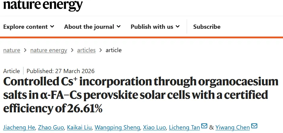 甲脒-铯金属卤化物钙钛矿(FA₁₋ₓCsₓPbI₃)的两步法制备工艺能够对结晶过程进行卓越的调控,因此更适用于太阳能电池的制造。然而,由于Cs⁺掺入效率有限以及相变机制尚不明确,形成稳定器件所需的理想α相仍面临挑战。近日,南昌大学陈义旺、谈利承等单位设计了一种有机铯盐——4-(二苯基膦基)苯甲酸铯,以实现高效的Cs⁺掺杂并均匀化阳离子分布,从而获得了具有更高相稳定性的高质量钙钛矿薄膜。最终,通过两步法制备的太阳能电池实现了26.91%的光电转换效率(认证效率为26.61%)。采用热稳定电荷传输层的器件,在1倍太阳光照射、最大功率点追踪及85°C条件下(符合ISOS-L-2协议)连续运行1500小时后,仍能保持其初始效率(23.76%)的95%。本研究揭示了FA₀.₉Cs₀.₁PbI₃的相变路径及其对应的过渡态结构,并阐明了Cs⁺驱动钙钛矿晶格稳定的机制。该文章以“Controlled Cs⁺ incorporation through organocaesium salts in α-FA–Cs perovskite solar cells with a certified efficiency of 26.61%”为题发表在国际著名期刊《Nature Energy》。原文链接:https://doi.org/10.1038/s41560-026-02016-7图1:相变的动力学与热力学分析。