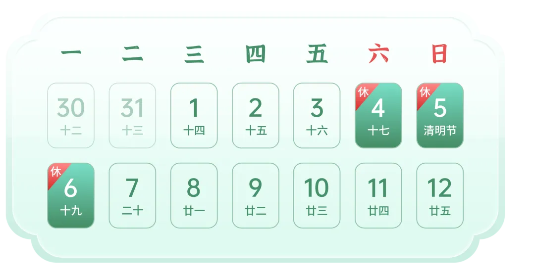 您好!清明节是缅怀先辈、亲近自然的传统节日,根据国务院办公厅通知,结合学校实际,我校2026年清明节假期安排如下: