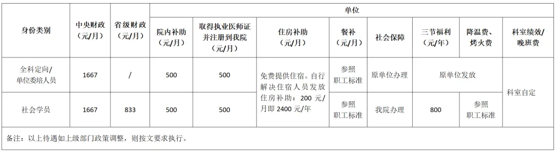 1.培训对象按照规定享受相关待遇(详见下表),不需缴纳培养费,生活补助由本院负责发放,标准参照国家和本省相关文件执行。享有法定节假日休假;医院按规定办理参加执业医师考试及注册管理手续。