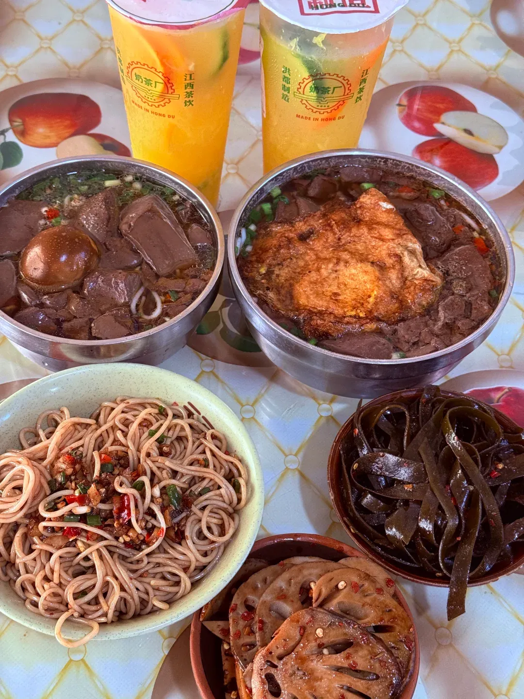 招牌牛肠、猪血汤、南昌拌粉,牛肠卤得软烂入味,和猪血粉搭配堪称绝配;单独的猪血汤清淡爽口,虾米提鲜,解辣又暖胃。