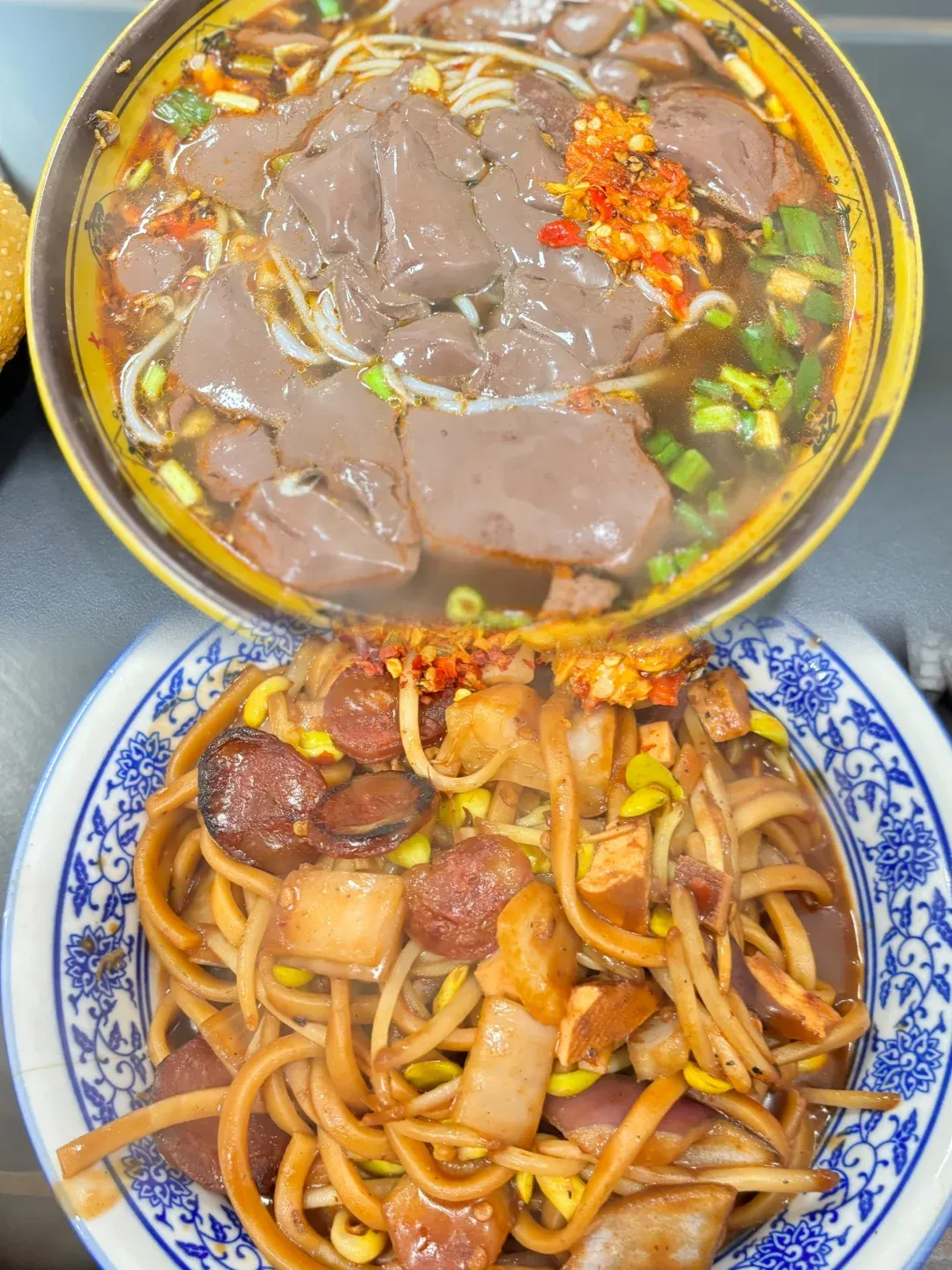 招牌肥肠杂酱面、猪血汤、冰糖雪梨汤,肥肠卤制软烂入味,杂酱面咸香适口,冰糖雪梨汤清甜温润,完美中和辣味,是店内标配组合。