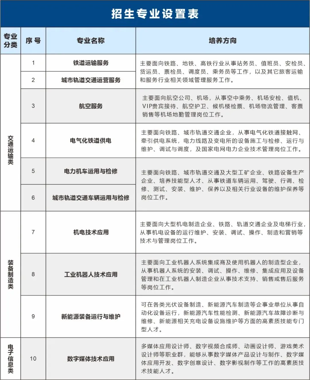 学校自创办以来一直专注铁路人才培养,是目前江西颇具特色的一所以轨道交通类为主的中等专业学校。学校已开设铁道运输服务、电气化铁道供电、电力机车运用与检修、工业机器人技术应用、航空服务、机电技术应用、新能源装备运行与维护、数字媒体技术应用等主要专业,涵盖装备制造、交通运输、电子信息等三大类专业。教育始于初心,成果源于用心,学校先后获得“南昌市优秀等级学校”“1+X证书联盟牵头学校”“江西省教育系统先进集体”“南昌市教育系统立德树人综合考核一等奖"等诸多荣誉。学校有五个专业被评为南昌市职业教育“精品特色专业”,三个工作室被评为“技能名师工作室”,学校多年来的办学成果备受社会赞誉,被誉为学生满意、家长放心的铁路轨道交通人才培养的摇篮!