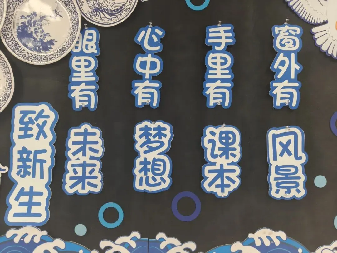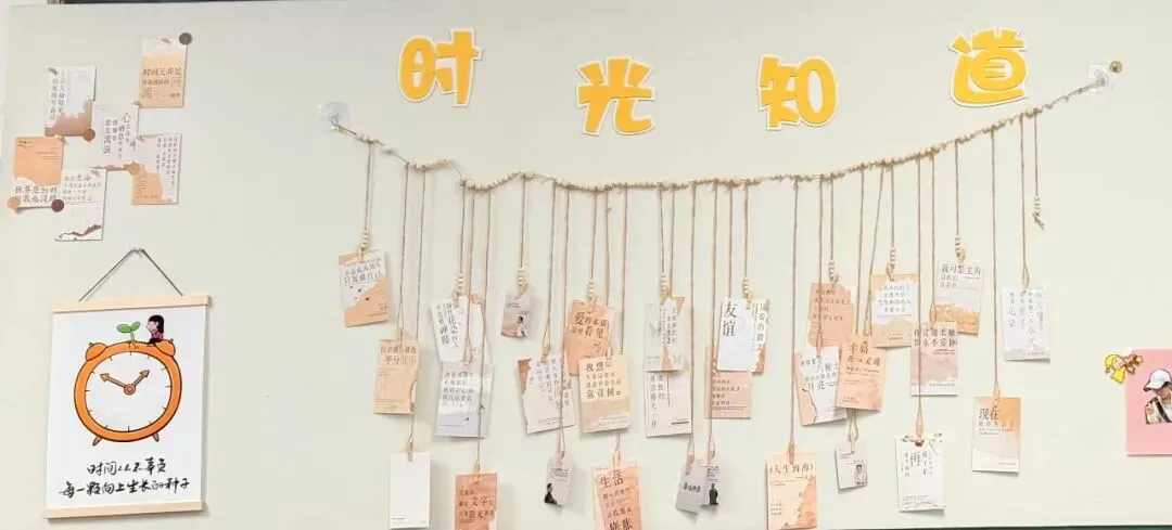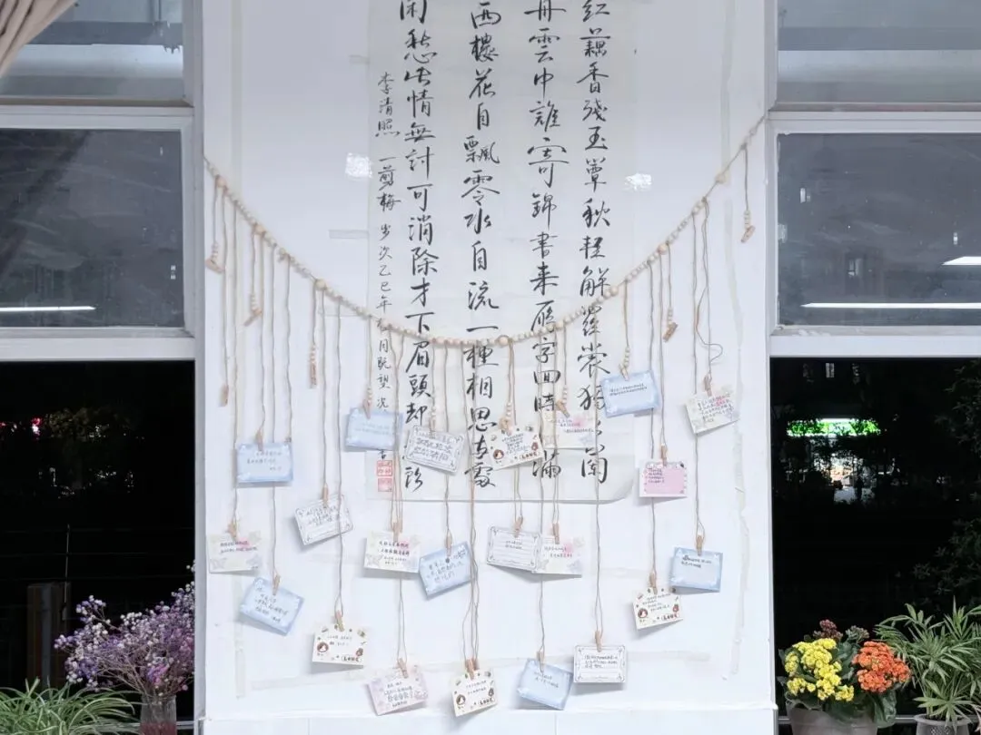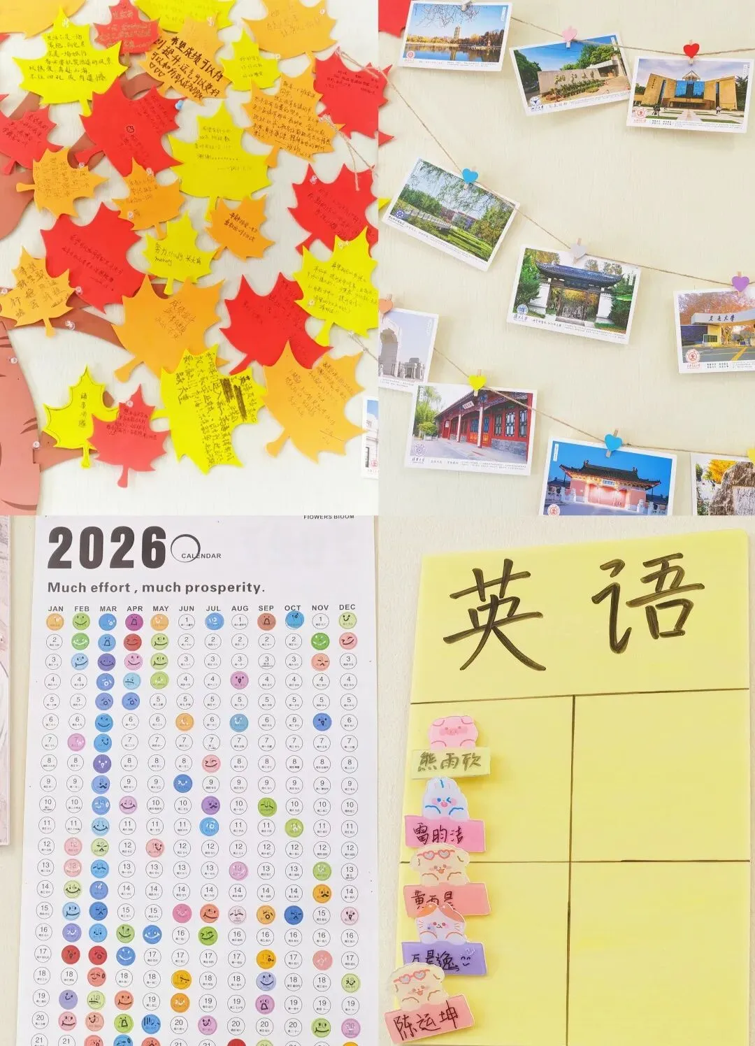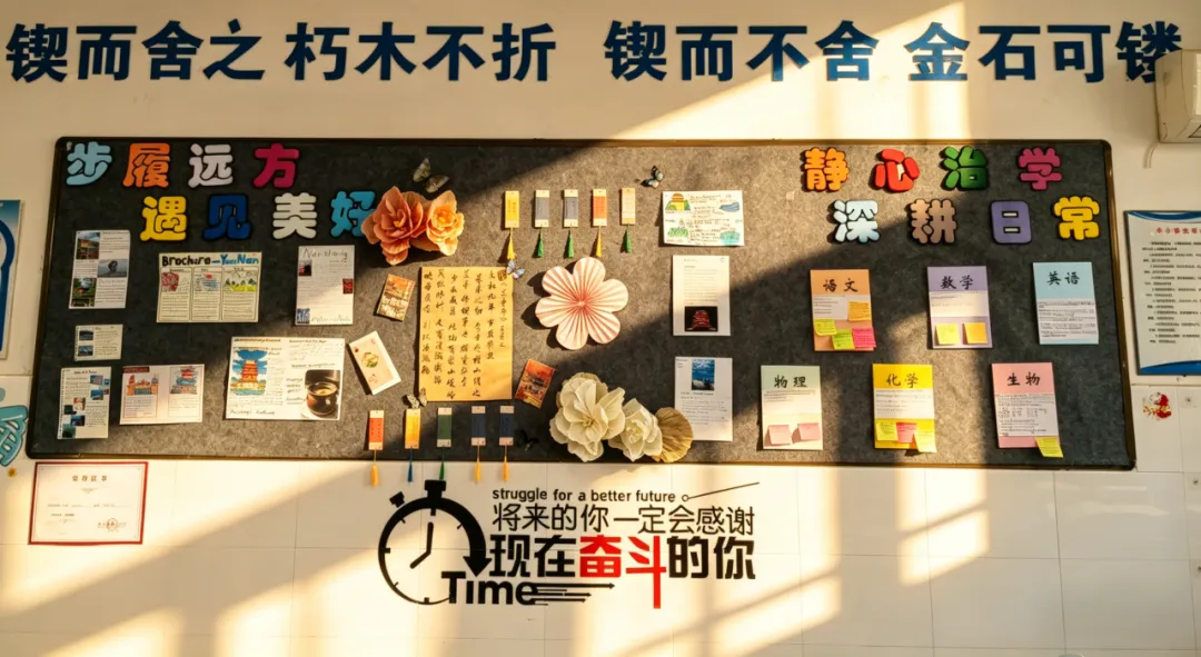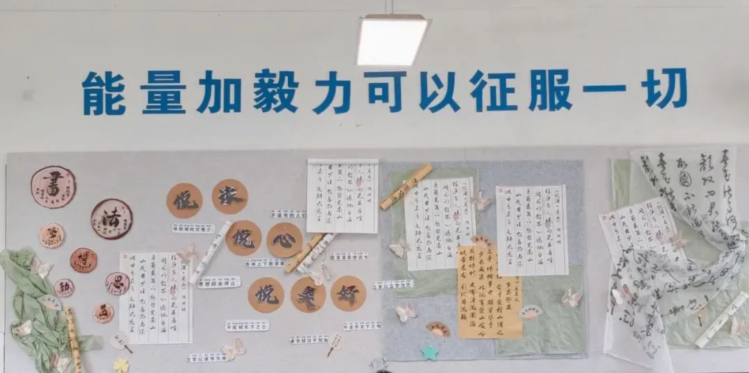 中间以手工纸花、书法作品等细节装饰,以美育人、以文化人,让教室兼具书香与美感。