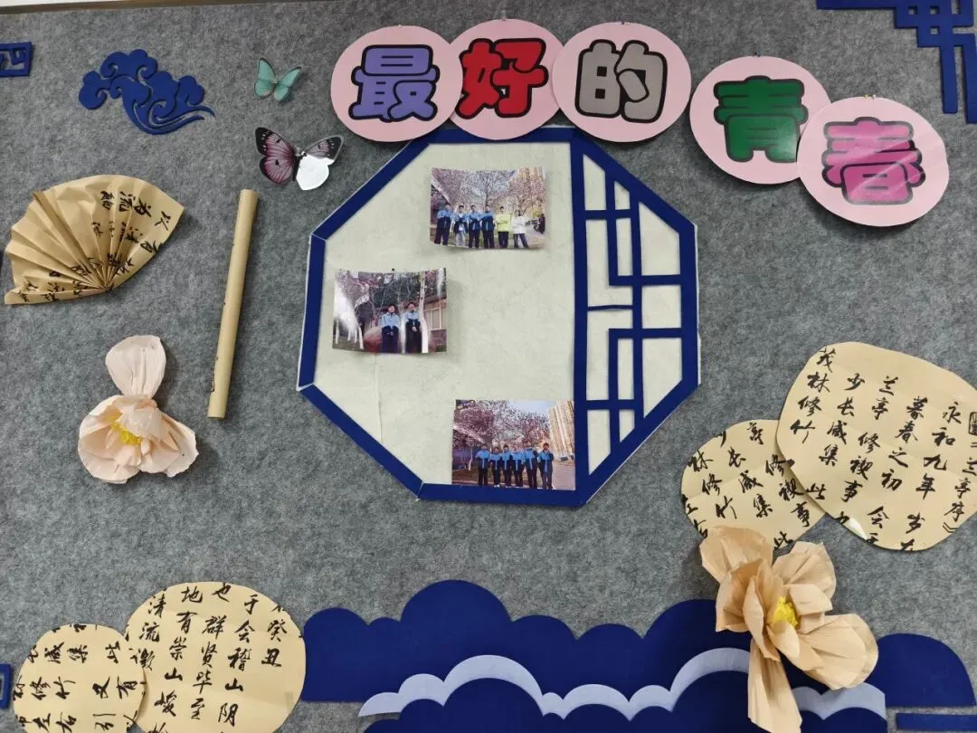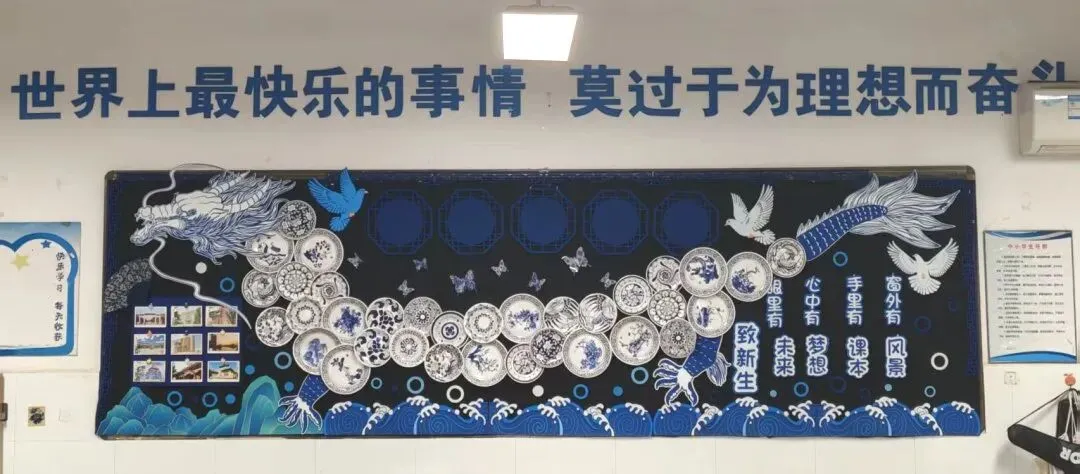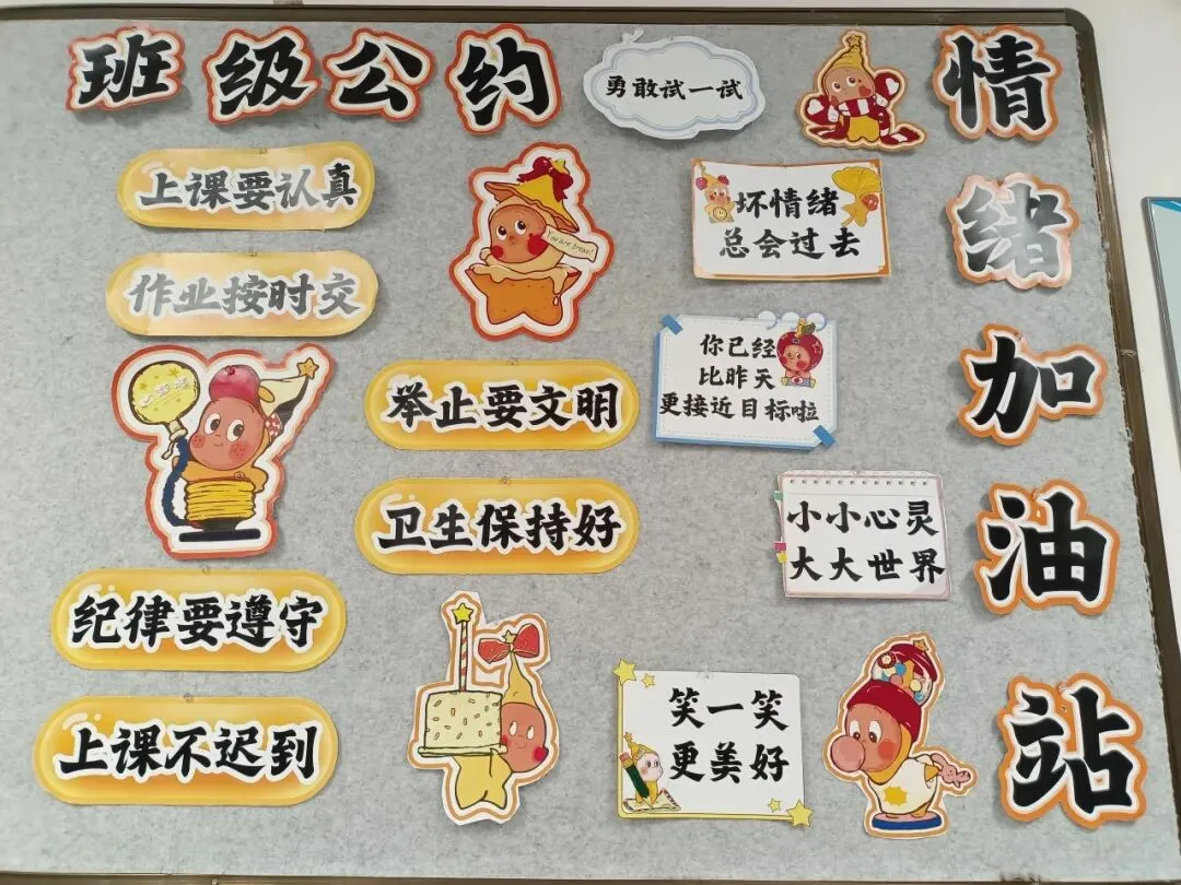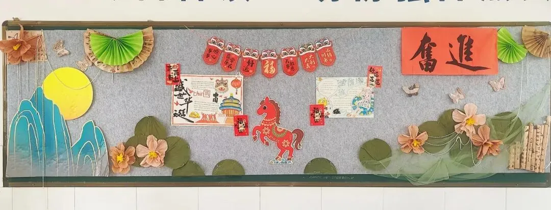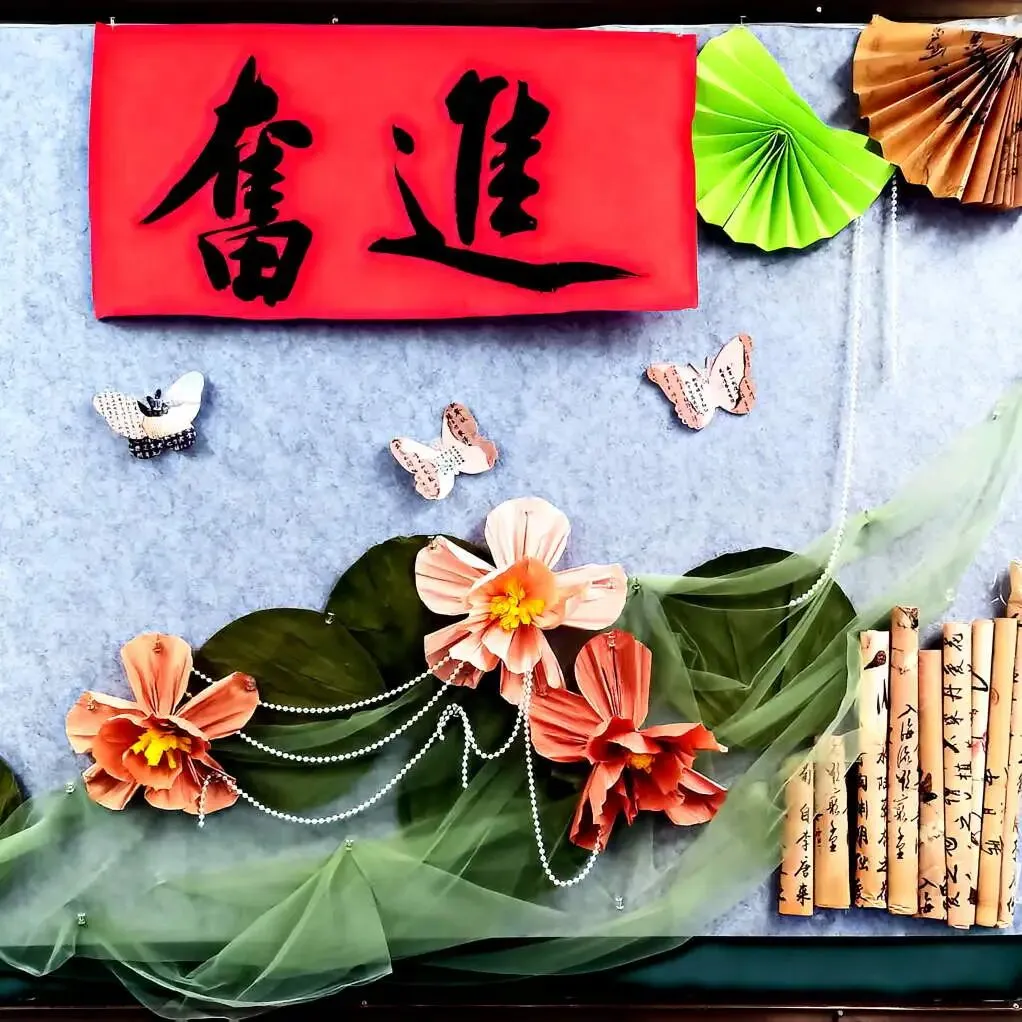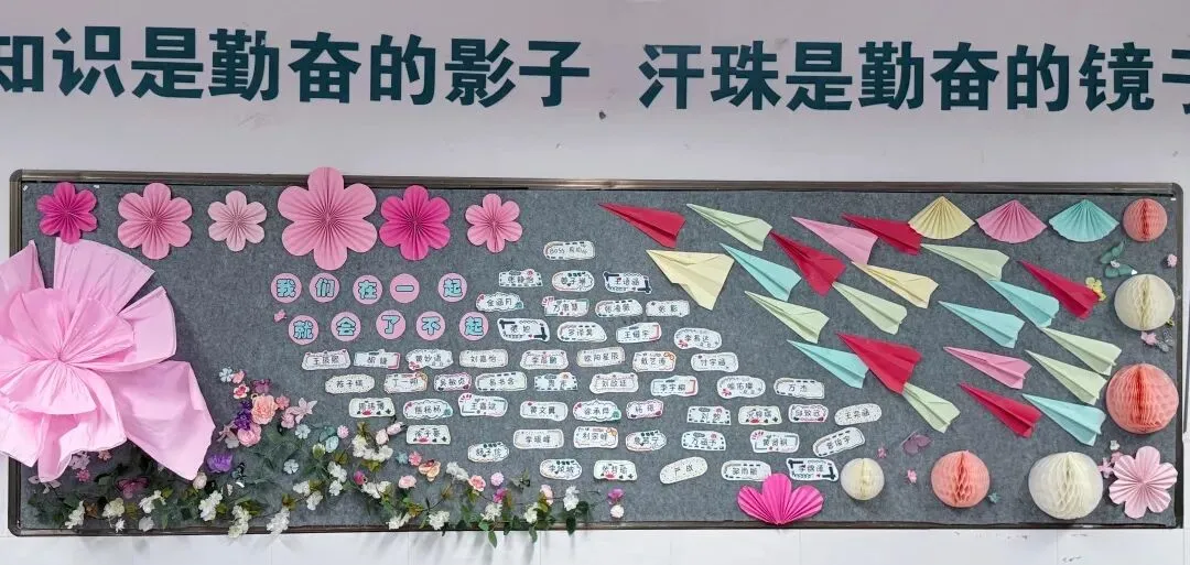 中间以手工纸花、书法作品等细节装饰,以美育人、以文化人,让教室兼具书香与美感。