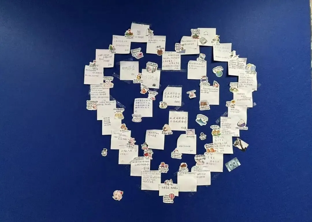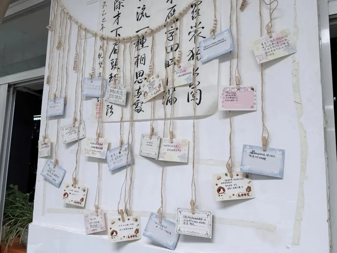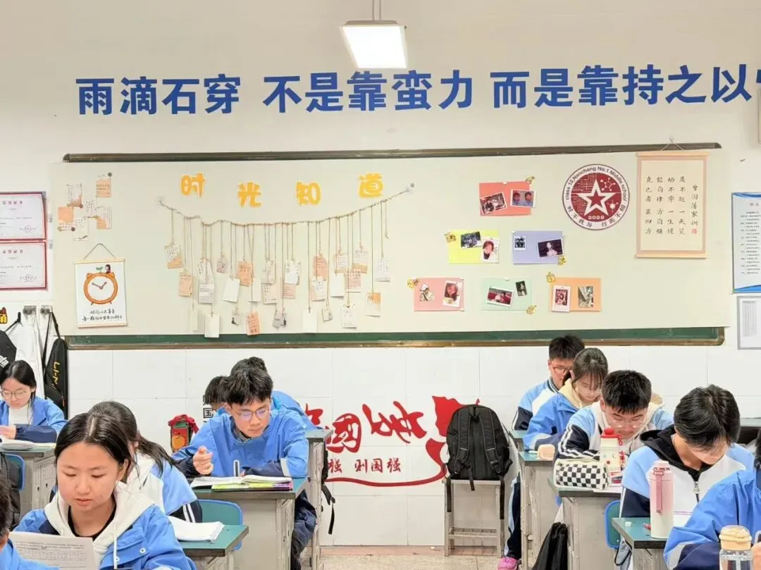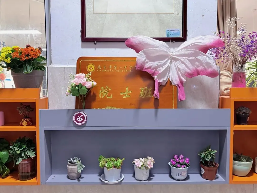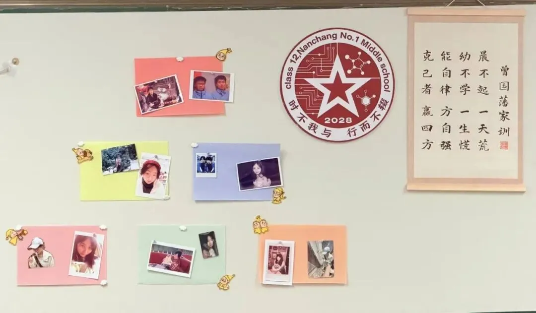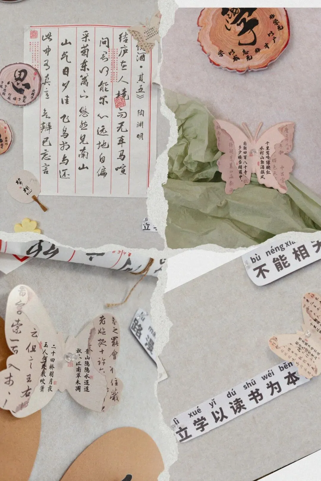 中间以手工纸花、书法作品等细节装饰,以美育人、以文化人,让教室兼具书香与美感。